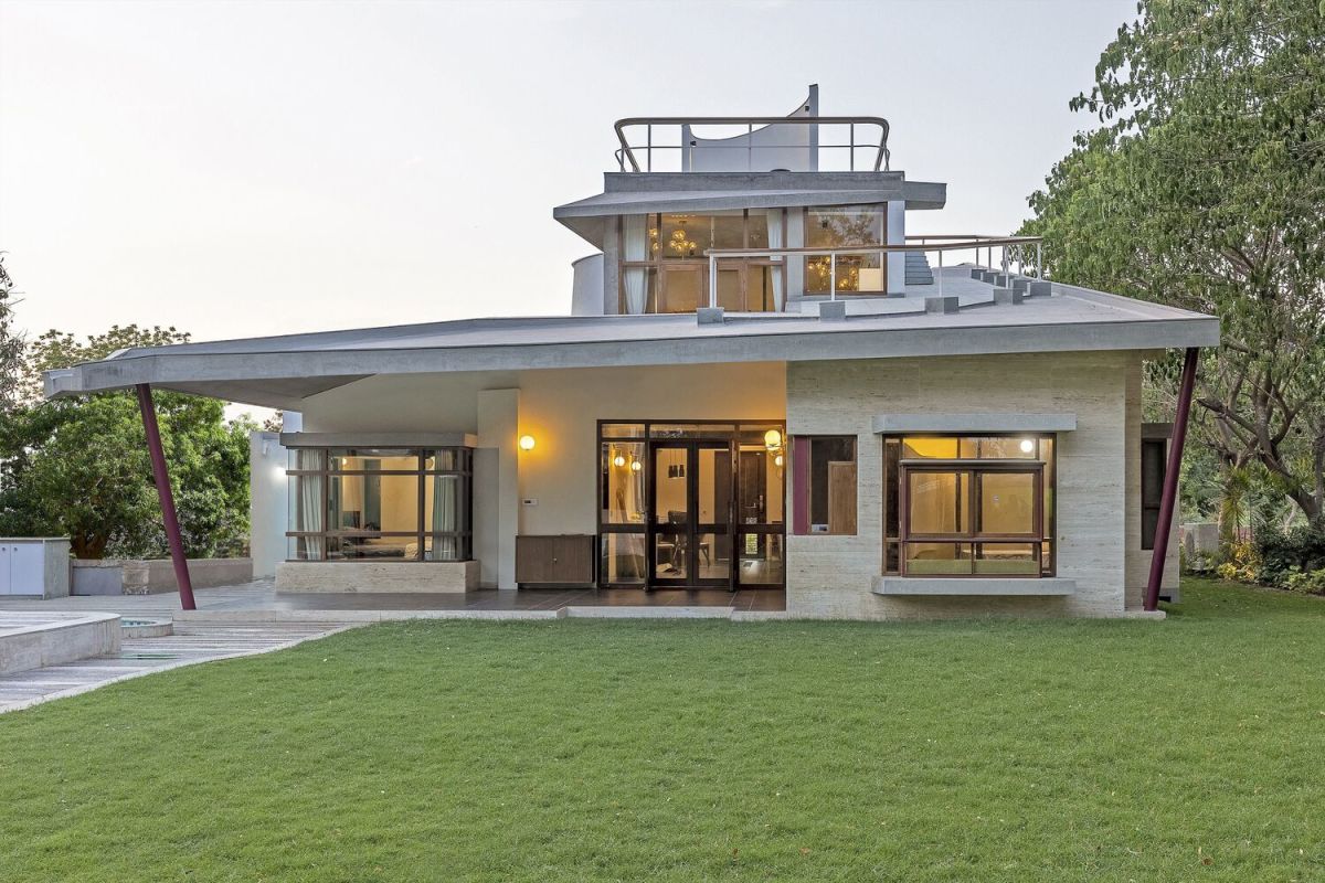 ẤN ĐỘ- Mái nhà nhô lên ở 2 cạnh và được chống đỡ bởi những cột thép mô phỏng hình chiếc lều, ở giữa là lối dẫn lên sân thượng. Ngôi nhà có quy mô 1,5 tầng, được xây dựng trên