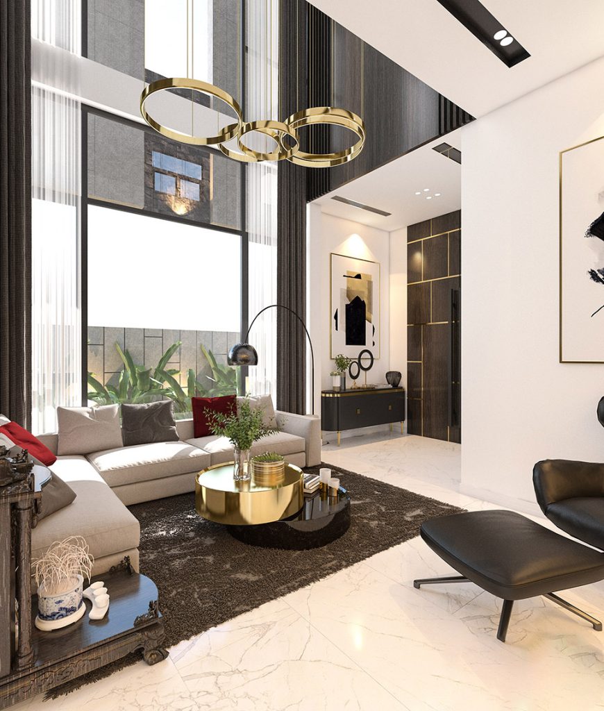 Phòng khách sử dụng khoảng thông tầng trong các ngôi nhà cao tạo được không gian thoáng đãng. Nếu mở được ô cửa sổ lớn, rộng cả bức tường, rất bề thế và sang trọng. Tấm rèm cửa buông hờ hững hoặc vén sang hai bên như bức màn sân khấu, kết hợp với phong cảnh cây xanh phía ngoài tạo nên ấn tượng một bức tranh thiên nhiên đẹp.