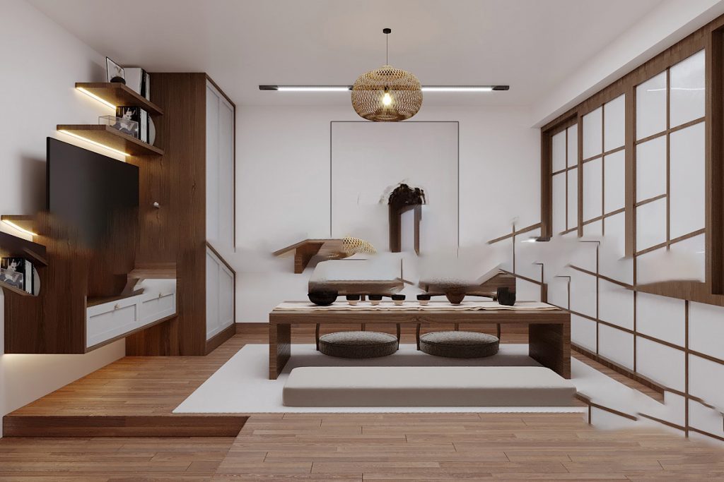 Tùy theo điều kiện diện tích ở mà bố trí phòng sinh hoạt chung cho vừa phải. Không nhất thiết phải là phòng khép kín. Bạn có thể tạo ra một sảnh rộng nơi đầu cầu thang, khoảng 10-12m2 hoặc nhỏ hơn nữa. Diện tích có thể chỉ đủ kê một salon hoặc không kê đồ đạc gì cả, mà nâng cao độ sàn lên khoảng 20-30cm, để rải rác một số gối nhỏ để tựa lưng khi ngồi xem tivi hay trò chuyện, uống trà. Bố trí theo kiểu nhà Nhật vừa không cần diện tích rộng vừa thân mật, ấm áp. Đẹp nhất là kế bên khung cửa sổ, thấp thoáng bóng cây xanh. Nếu đã bố trí phòng khách ở tầng 1 thì phòng sinh hoạt chung này nên ở tầng 2, để có sự riêng biệt cần thiết và tạo sự cơ động, linh hoạt. Khi bạn cần sử dụng tiếp khách toàn bộ tầng 1 thì bạn vẫn có không gian yên tĩnh cho gia đình ở tầng trên.