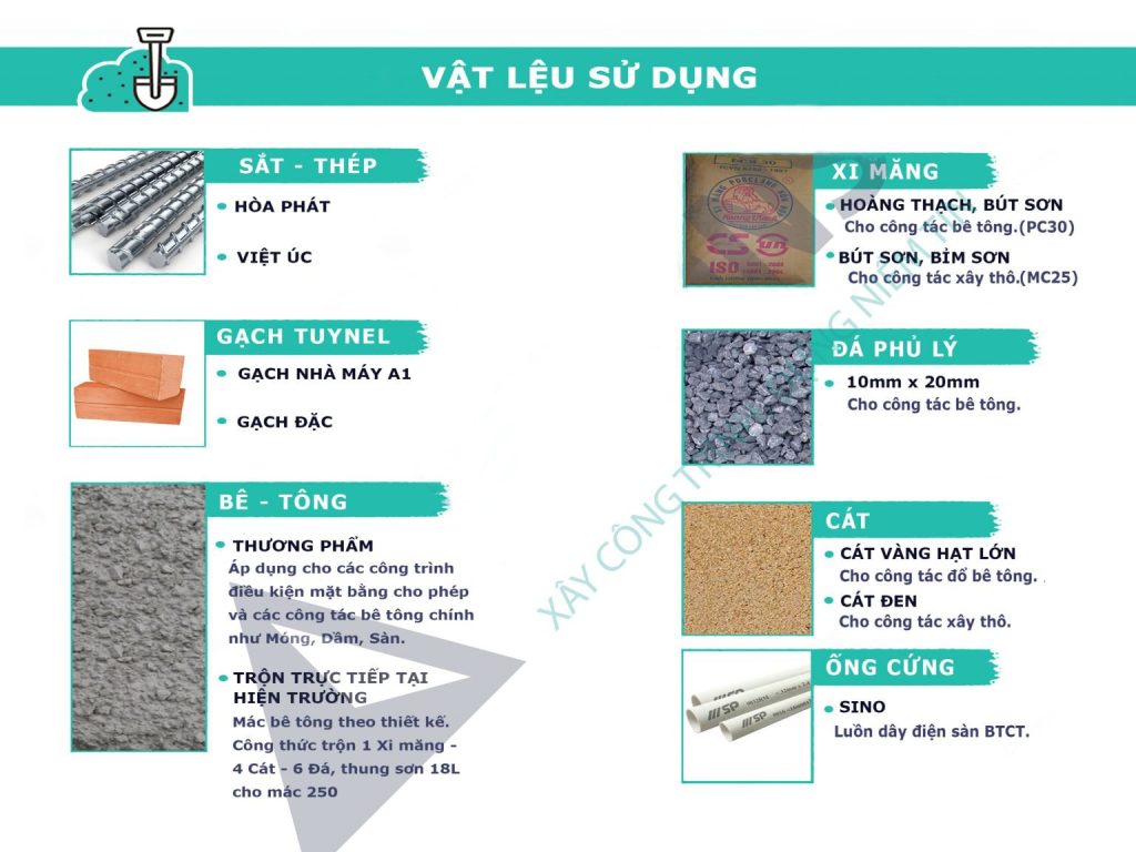 - Nguyên vật liệu nhà thầu cung cấp bao gồm: sắt thép, xi măng, cát sỏi, dây điện âm, đường ống nước, gạch, bê tông, cát san lấp, mái tôn, mái ngói, chất chống thấm, cốp pha (đều ghi rõ nguồn và đã được chủ đầu tư phê duyệt. đồng ý trước khi thi công).