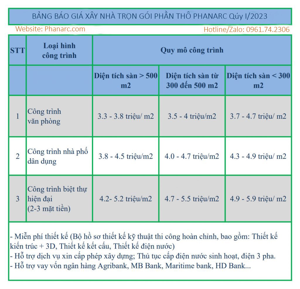 Đơn giá xây nhà trọn gói phần thô là đơn giá quy đổi theo mét vuông sàn, được tính bằng TỔNG GIÁ TRỊ CÔNG TRÌNH (được xác định qua công tác bóc tách khối lượng theo bản vẽ và lập dự toán) chia cho TỔNG DIỆN TÍCH SÀN (tính diện tích theo giọt gianh mái). Ở đây PHANARC muốn quý khách hàng hiểu rằng đơn giá xây dựng theo m2 sàn sẽ được hình thành sau khi có tổng giá trị dự toán công trình và sẽ phụ thuộc phần nhiều vào tổng diện tích sàn xây dựng